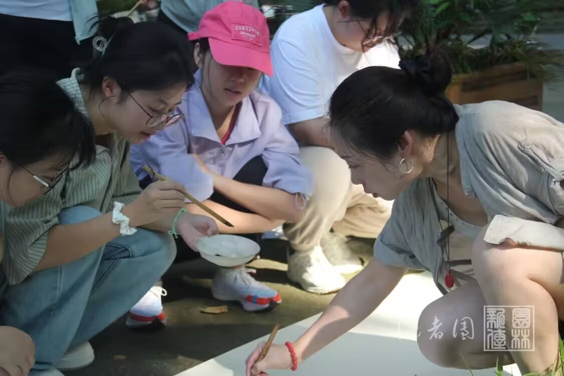 8月30日上午,2024级景园专业的新同学聚集在了景园楼门外张之洞雕像前的一块空地上,进行以画竹为主要内容的“景园心涂”水墨画涂鸦活动。在同学们开始实践前,风景园林系老师洪勇辉、黄滟向同学们讲解了画竹的原理、步骤、技巧,以及画材等选择。新生们跃跃欲试,仔细挑选画材、构思、调色……老师们在一旁观察着同学们的画作,亲自动笔示范,为同学们细致地讲解画竹的技法,并鼓励同学们根据自己的想法为画作增添灵气。色彩在长卷上跳跃、交织,像是走进魔法世界,把平淡无奇的白纸变得灵动飘逸。随后师生共同进入扇形景园楼内共同参观,深入了解了学校和专业的历史底蕴和文化传统,感受到了更人文、更开放、更自在的校园氛围。