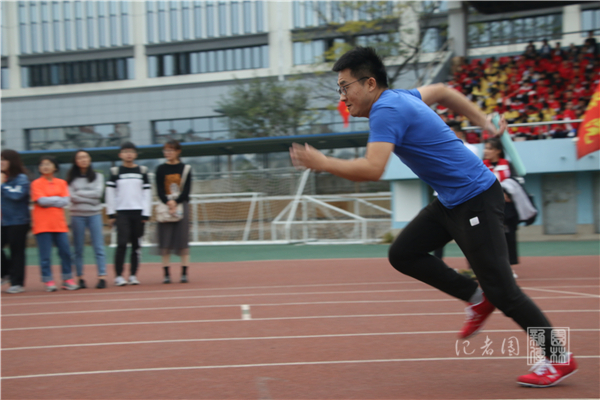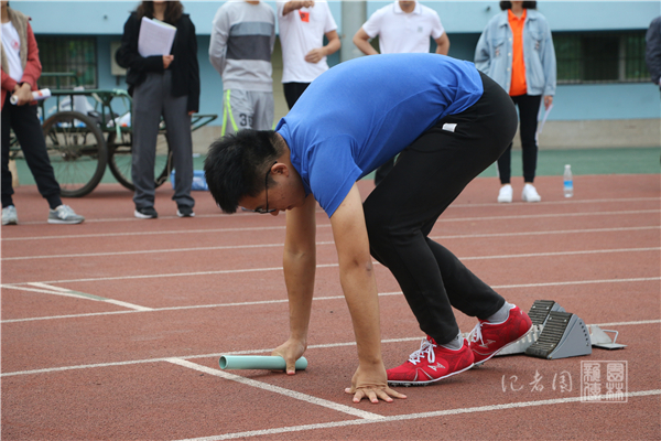 弯腰、屏气、目视前方,跑第一棒的徐行老师专注地为比赛做着准备。只听一声枪响,徐行老师便尽全力向前飞奔,还未回过神,他已与跑第二棒的陈炉丹主任完成了交接。
