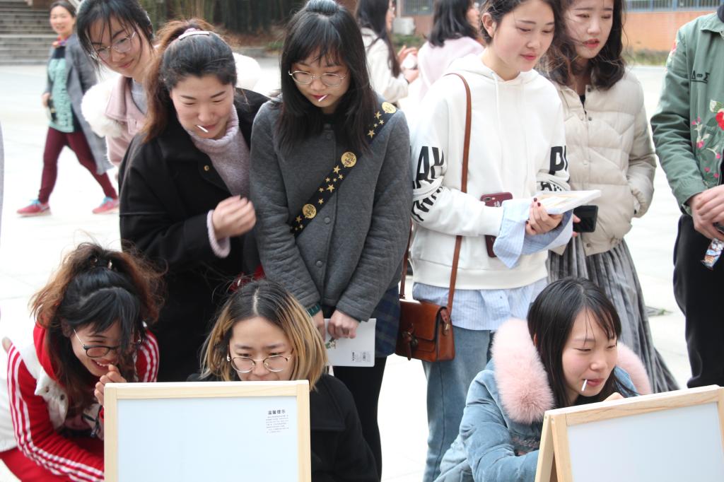 活动伊始,艺术团的同学合唱《我和我的祖国》与《狮子山下》两首歌曲,将现场气氛逐渐活跃,为游戏的互动环节做足了铺垫。四轮游戏设置的核心主要从童年、信任、默契、和释放这四个关键词展开。“我的童年分你一半”,要求参与者依次完成跳房子和踢毽子的相关任务,将师生们童年记忆中的游戏再度重现,展现出了老师们最欢快的一面。而在闭眼指挥游戏中,挑战者要在闭眼状态下借助同伴的指引来完成行走任务,搭档之间互相信任,默契十足。“一起做表情”游戏,让老师们在挑战过程中,释放天性,表现出相应的表情来赢得心仪的表情玩偶。有趣的游戏和精美的小奖品,激发了老师和同学们的参与热情。不同于课堂上的严肃状态,一个个游戏将师生之间的距离迅速拉近,师生同乐,共同度过了一个轻松惬意的下午。