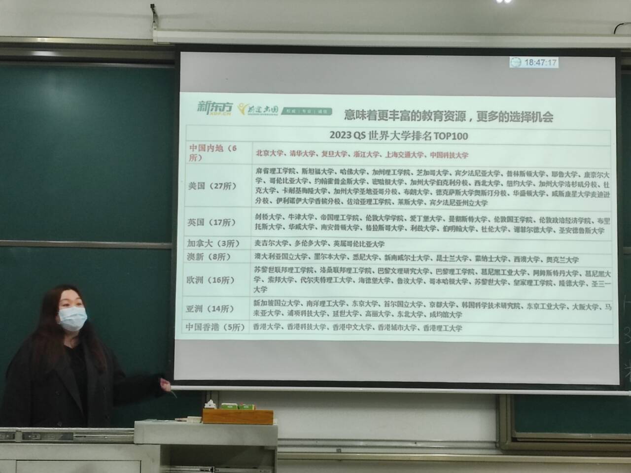 为帮助毕业生分析留学现状,搭建留学经验交流平台,3月12日晚上,艾弗森贝博ballbet官网邀请新东方教育机构的吴偲讲师,在第四教学楼C109开展留学专项讲座,针对海外留学的选择规划方面,为同学们进行了全面讲解。