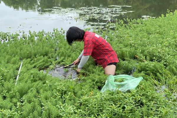 7月15日至19日,天气持续高温,团队成员在田间地头进行踏查,在安陆市先后完成了16个乡镇的调查工作。进行样方调查时,成员们先将样方杆呈正方形放置在目标地点,而后对样方内的目标物种进行盖度评估,并对总植物数量和目标植物数量进行计数,最后将目标植物全部割下来称取鲜重。同时,团队完成了对各个样方及生境总体、目标植物细节的拍摄记录工作。此外,成员们在踏查样线的同时,还会逐一辨别路线上的目标植物,并拍照留档、采集标本,争取不漏一株植物、不错一种物种。完成室外劳作回后,大家一起进行标本压制以及鲜样的烘干。7月19日,在完成安陆市的调查工作后,实践团队奔赴云梦县开展下一步调查。有了前期的经验,实践团队愈发娴熟,快速前往各地直接展开调查,甚至在一个上午完成了对十个目标地点的踏查任务。