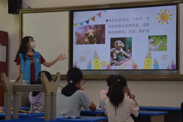 7月11日下午两点,实践团前往我校附属学校开展了以“萌宠读心术”为主题的特色科普课堂活动。上课铃声响起,动医2006班的张佳铭首先为小朋友介绍了课程目标及板块,进行了“猜猜我是谁”的有奖竞答环节。通过看图片局部猜动物,小朋友们热情高涨,积极参与互动,课堂氛围一下子轻松活跃起来。