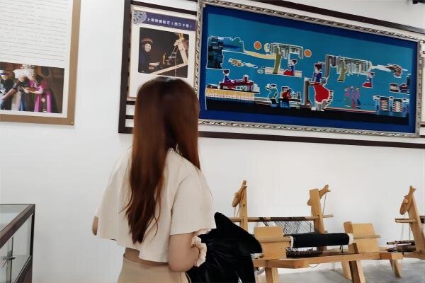 随后,为了深入认识非遗和乡村振兴之间的有机联系,实践团队来到了恩施土家女儿城。在民族氛围浓厚的土家女儿城,西兰卡普、土家漆器、傩戏面具等一项项非遗或以装饰或商品的形式生动地呈现在成员们的面前,成员们发现非遗与旅游业的有机结合也是传承保护文化、推动经济发展的一大助力。