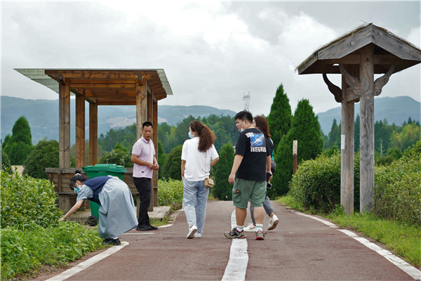在村支书的带领下,实践团参观了茶园等一系列相关设施,同时拜访了开设民宿的房东和当地居民。队员们在采访中了解到新亭村在过去的二十年只有黄泥路,茶园废弃、交通极其不便。但近年来百丈漈镇大力推动旅游业的发展,新亭村村民利用茶园、青山等绿色资源,积极发展旅游业,延长产业链,谋划做好乡村田园旅游的文章,吸引了众多周边城镇人民来到此地避暑、采风、旅行,促进了当地的经济发展。