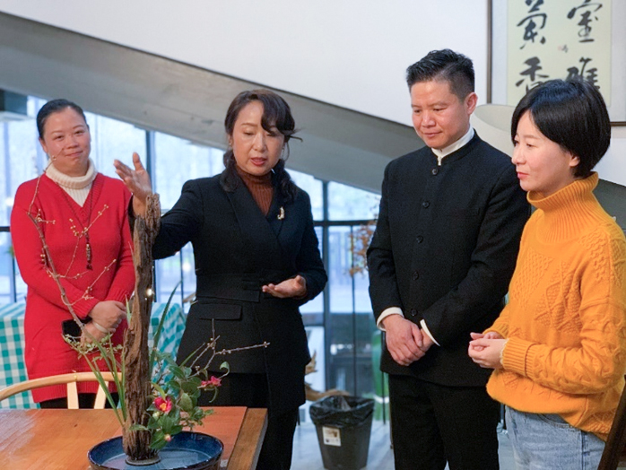 小寒篇“姹紫嫣红花园里”活动现场设在汉阳五境花园董事长孙艳霞董事长的五境花园。艾弗森贝博ballbet官网张蔚副教授作为嘉宾主持,带领花友们一边游览空间室外花境冬季景色。孙艳霞向花友们介绍了五境花园的创立初心——综合性的沉浸体验。宾客可以进行多彩多姿的体验活动如插花、花艺、绿植组合设计以及美食、读书会和抚琴等。活动结尾,五境花园特邀梁朋花艺师应小寒节气现场创作中国传统插花,利用枯荣相生的自然理念,以枯木、蜡梅枝、茶花等表现小寒的“三侯”意象,也表达对于自然与生活深层次意境的追求。