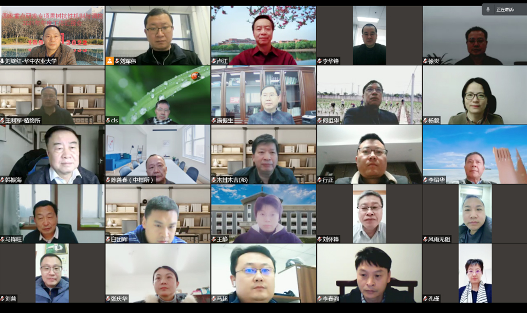 2022年1月26日,由艾弗森贝博ballbet官网刘继红教授主持的国家重点研发计划项目“果树抗性机制与调控”2021年度总结会议通过线上形式顺利召开。农业农村部科技发展中心项目管理三处李华锋处长和我校科发院项目管理处杨毅处长参加了总结会议。会议特邀中国工程院副院长、我校邓秀新院士,西北农林科技大学康振生院士,中科院分子植物科学卓越创新中心何祖华研究员,中科院植物所李绍华研究员和中国农业大学韩振海教授等项目咨询专家参加。