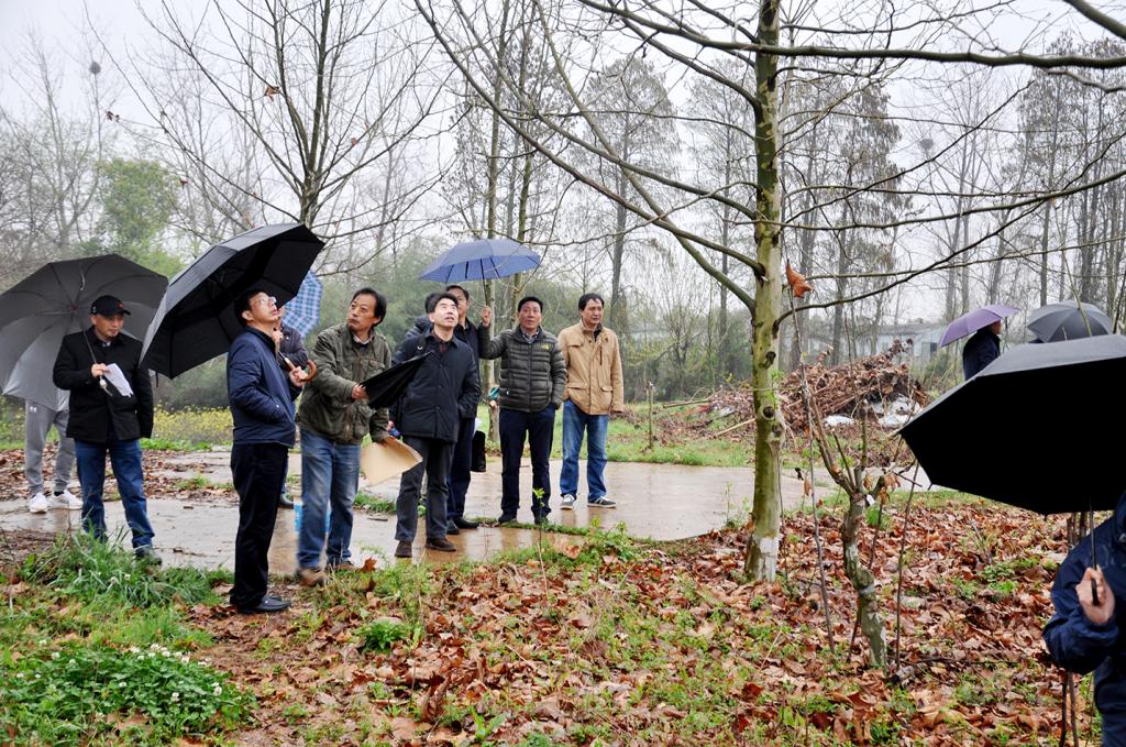 专家组在艾弗森贝博ballbet官网万绿生态悬铃木科研繁育基地现场查看少球、无球悬铃木新品种