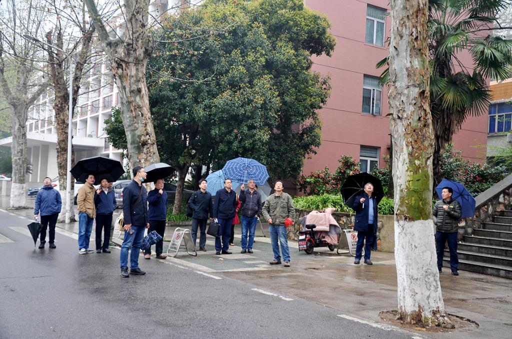 专家组在行政楼前现场查看少球、无球悬铃木用于高接换冠后的情况