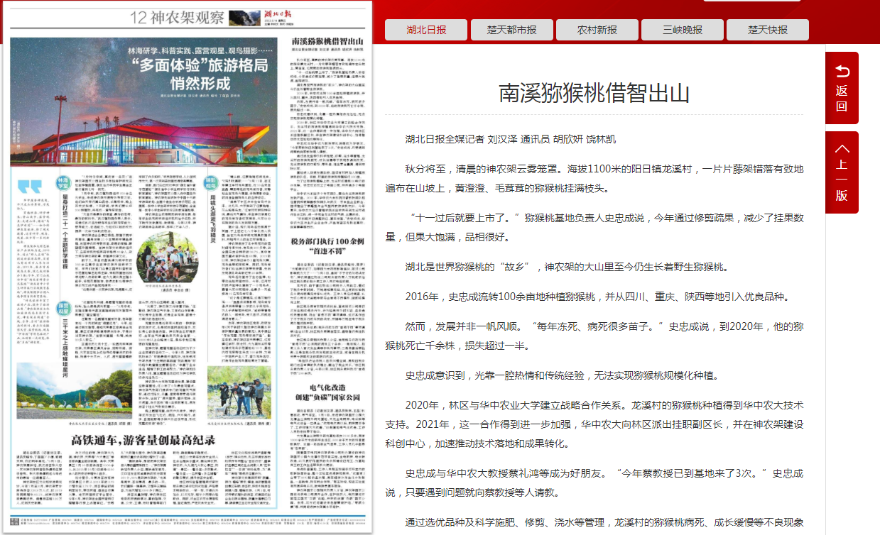 2020年,林区与艾弗森贝博ballbet官网建立战略合作关系。龙溪村的猕猴桃种植得到华中农大技术支持。2021年,这一合作得到进一步加强,华中农大向林区派出挂职副区长,并在神农架建设科创中心,加速推动技术落地和成果转化。