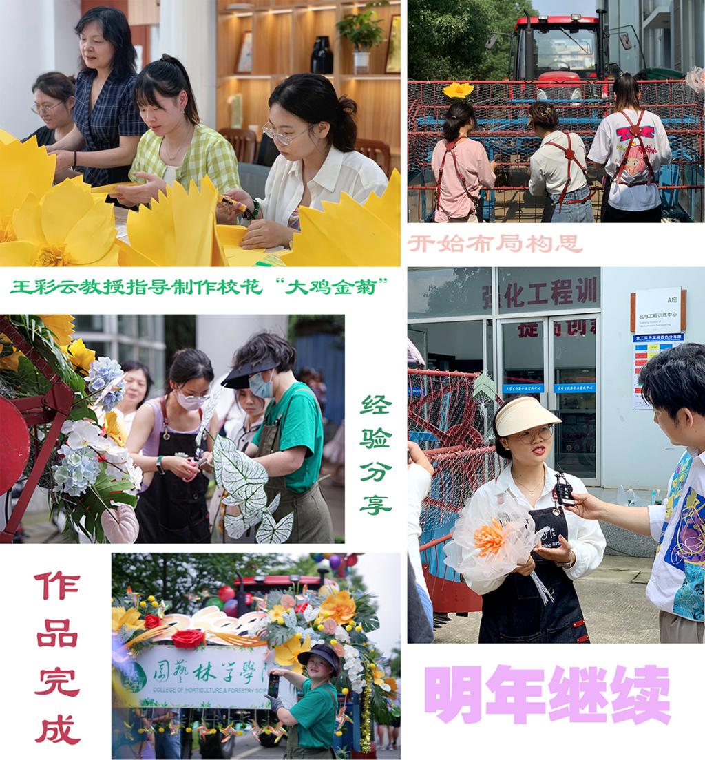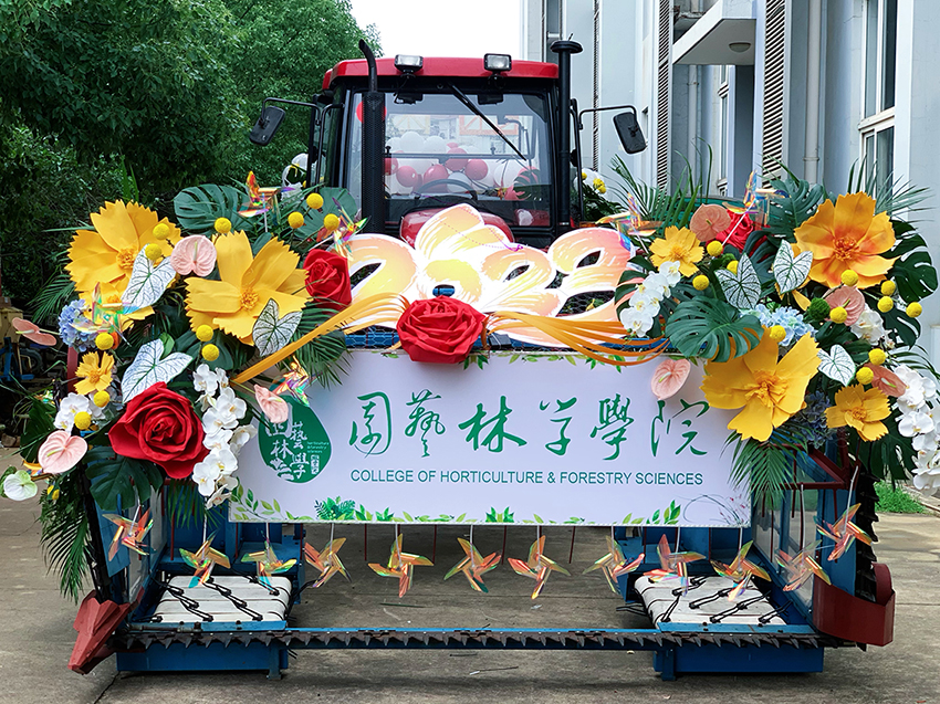 铁机龙舟,踏歌而行。园林院花车整体花团锦簇,校花大金鸡菊代表着同学不畏艰苦困境的精神,每一位园林人又有着玫瑰的热烈与浪漫,用无悔的青春创造着美好生活!狮山风响,风动花香,香培玉琢,玉汝于成!花车内蔬果飘香象征着园林院学术上的磊磊硕果也为毕业生们献上收获的喜悦,森林、园林,林下风致;果树、花蔬,书声琅琅;设施,茶事,事事关心,车轮滚滚,四季轮回,六月蝴蝶,群芳盛开。鲜花构筑起车的骨架代表了毕业生四年来朵朵珍贵的回忆,车后巨大的蝴蝶结与气球束将大家拉回夏日的童年,希望大家千帆过尽,归来仍是少年!保留一份青春的纯真与好奇。巡游方阵气球上展示了园林院所有本科毕业生的毕业论文题目希望同学们以此为起点,在未来继续努力创造美好,有花有果,春华秋实,四年之期已满,丰收之时已至。看园里,林荫已茂,茶韵远飘;观棚内,繁花怒放,瓜果留香,园林人用自己的方式发现美好创造美好。