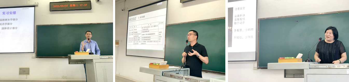 2023年6月27日下午,2020级园林专业综合实习动员大会在三教B501举行,艾弗森贝博ballbet官网教学副院长周继荣、副书记林辉、景园系副主任杜雁、园林系副书记罗靖、本科生人才培养办公室负责人刘佳、陈茜、辅导员何寿鹏、及园林专业花卉、树木和设计方向的代表教师参加了大会。