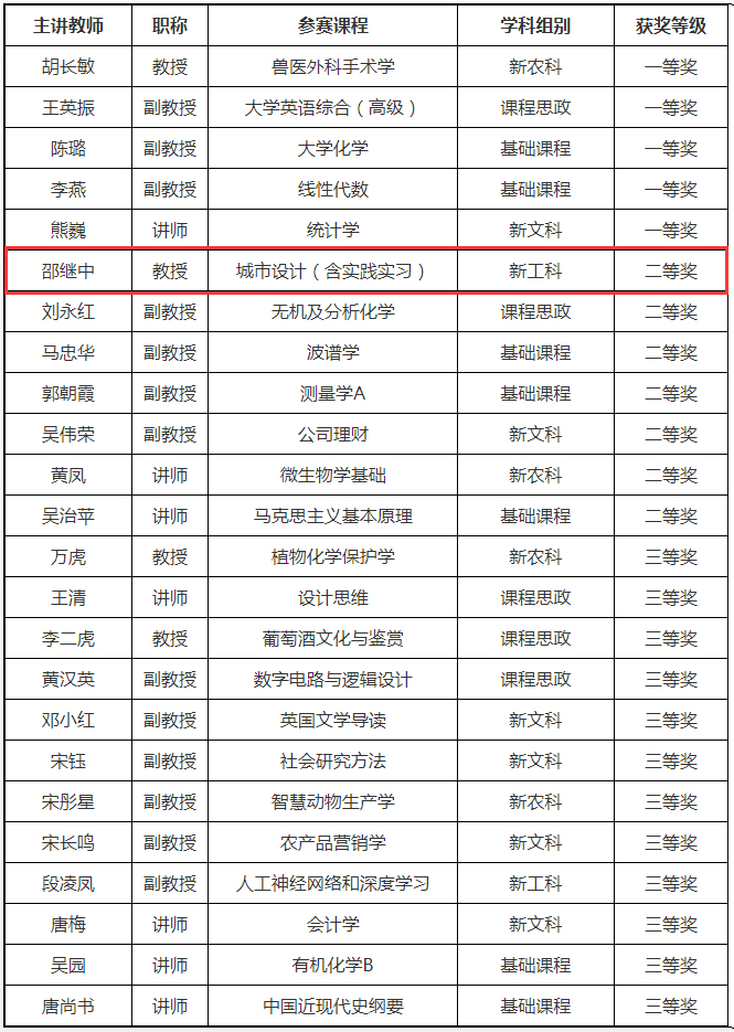 根据中国高等教育学会《关于举办第四届全国高校教师教学创新大赛的通知》、湖北省高等教育学会《关于举办第四届湖北省高校教师教学创新大赛的通知》等文件精神,按照艾弗森贝博ballbet官网第四届教师教学创新大赛赛事安排,经学院遴选推荐、材料评审、现场评审等环节,大赛最终评选出一等奖5人,二等奖7人,三等奖12人。贝博ballbet官网风景园林系教师邵继中团队获二等奖,团队成员杨璐、夏欣、丁静蕾。