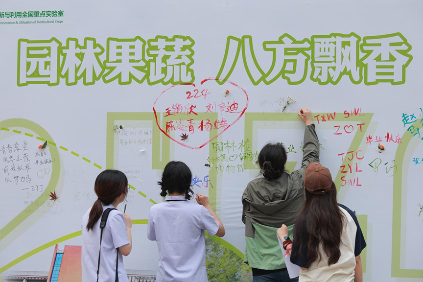 在花路起点处,竖立着一个留言展板,毕业生们纷纷拿起画笔,笔尖流转间,将内心的憧憬与期望化为五彩斑斓的印记。他们还将校园中的叶片、花朵粘贴上墙,每一片叶子都仿佛是他们青春岁月的缩影,每一朵鲜花也为他们进入下一人生阶段而鼓舞。“今年是我与园林院相伴的第七年,更是情谊深厚的几千朝暮。感谢园林院每一位老师的栽培,我会永远想念、永远热爱这里的一草一木、一花一果,后会有期,期待未来在更高处相见!”2021级风景园林系毕业生周俣轩在展板上用笔尖轻轻写下自己对未来的无限憧憬和坚定信念。