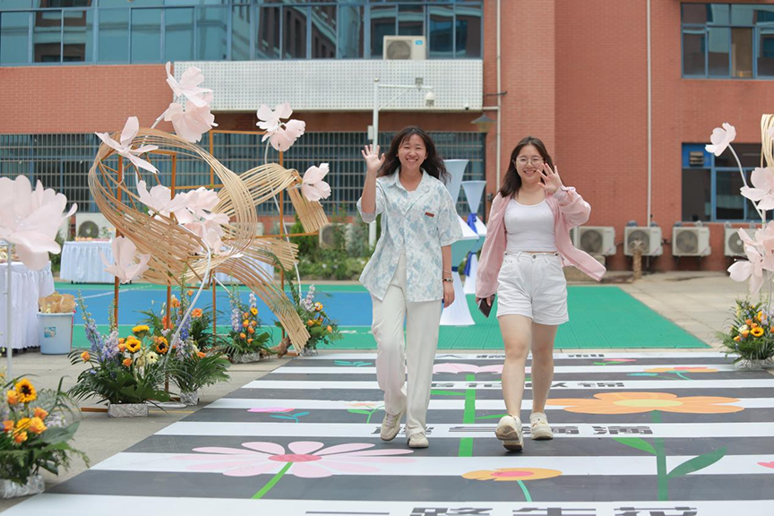 活动伊始,一条由鲜花和竹编装置装点的“花路”吸引了众人的目光。“一路生花是最初的设计概念,也是祝福毕业生们从学生走向社会的过程中,如这条路一般’一路生花’,繁花灿灿”,花路负责人2023级园林系研究生田嫚谈到,这已经是她们第二年用专业所学为师兄师姐送上祝福。今年的花路以“镜”以“框”来作主要元素,“以景自照”“不拘泥于框架”再加上“樱花”“向日葵”等繁花,以竹篾串联,为学生时代献上最后的花礼。在这条花路上,学弟学妹们手持花束,或是轻声细语地送上祝福语,或是挥动花束,为毕业生们勇往直前而加油鼓劲。毕业生们脸上洋溢着幸福的笑容,纷纷停下脚步合影留念,共同记录下这一难忘的时刻。