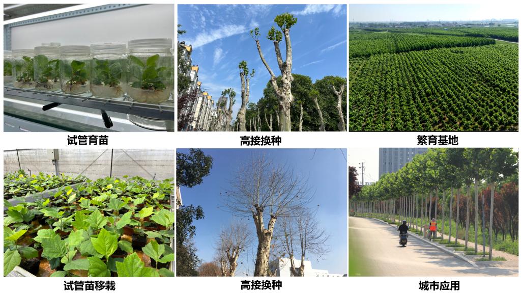 3.成果推广:包满珠教授的团队与武汉市农业科学院、武汉市花木有限公司、万绿生态园林股份有限公司、法雅生态环境集团有限公司等科研院所和企业合作,制定了悬铃木育苗、高接换种、整形修剪等技术规程,制定了完善的新建街道工程苗应用、已有悬铃木的高接改造技术方案,建立了新品种繁育基地6412亩,累计繁育高接苗26.2万株,已在全国十多个省市推广应用,累计应用高接苗及高接换种1.66万株,已形成良好的景观效果,推动产学研协同创新与乡村振兴有效结合,带动农民增收,促进了产业高质量发展,经济、生态、社会效益显著。