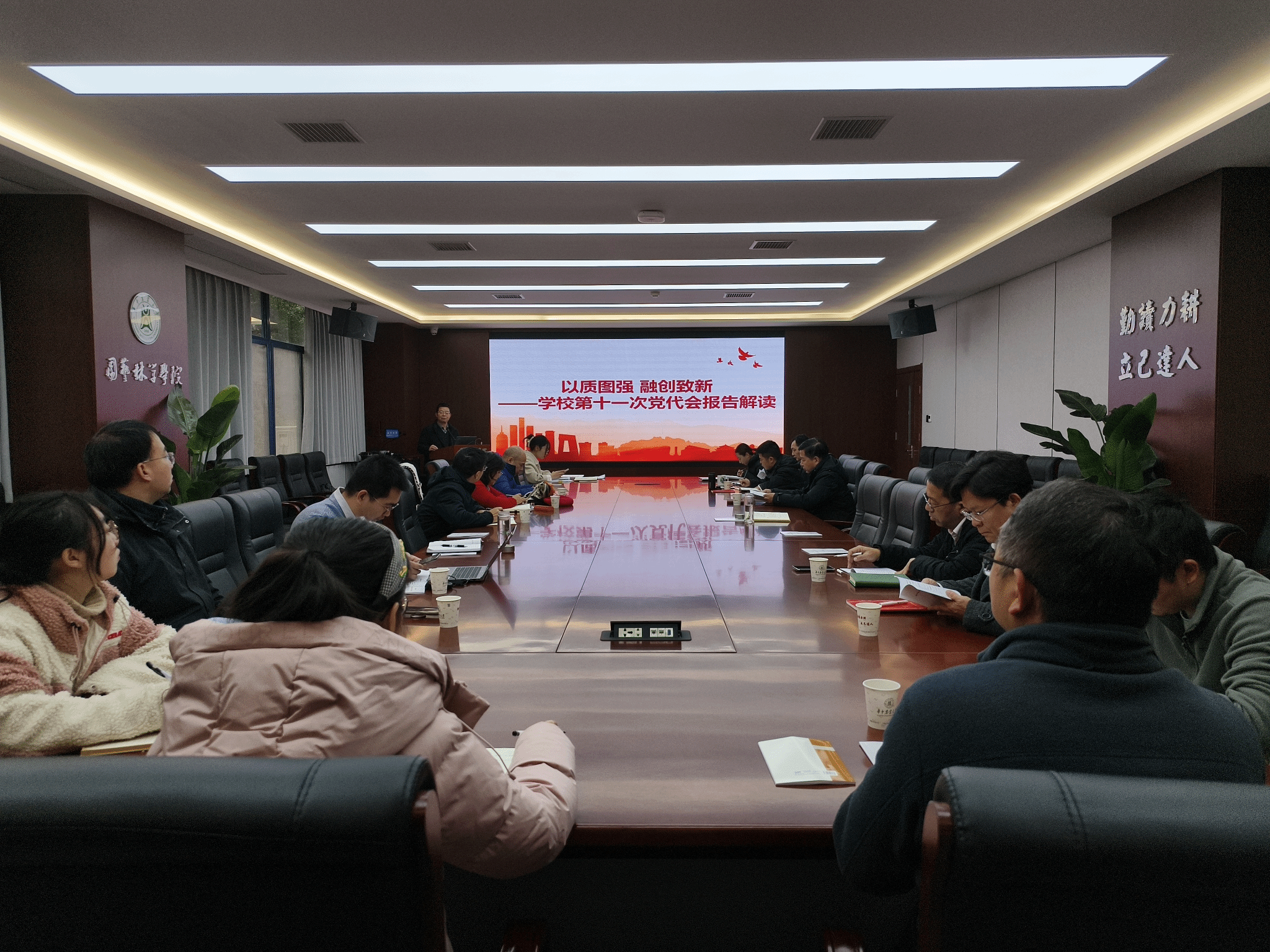会上,龙健飞传达了学校第十一次党代会的核心内容和精神,详细解读了党代会报告的主题:“以质图强 融创致新”,从教育教学、科研成果、师资队伍建设和国际交流合作等方面总结了学院发展与成果,同时指出了在“四个相比”下学院目前存在的问题与不足。他强调,学院要围绕“新战略指引新征程”的要求,以“以质图强、融创致新”为战略指引,全面提升学院的教学质量、科研水平和社会服务能力;通过实施“八项行动”提升“八力”,统筹实施“五项工程”,实现学校建设特色鲜明世界一流大学的新目标和新使命。