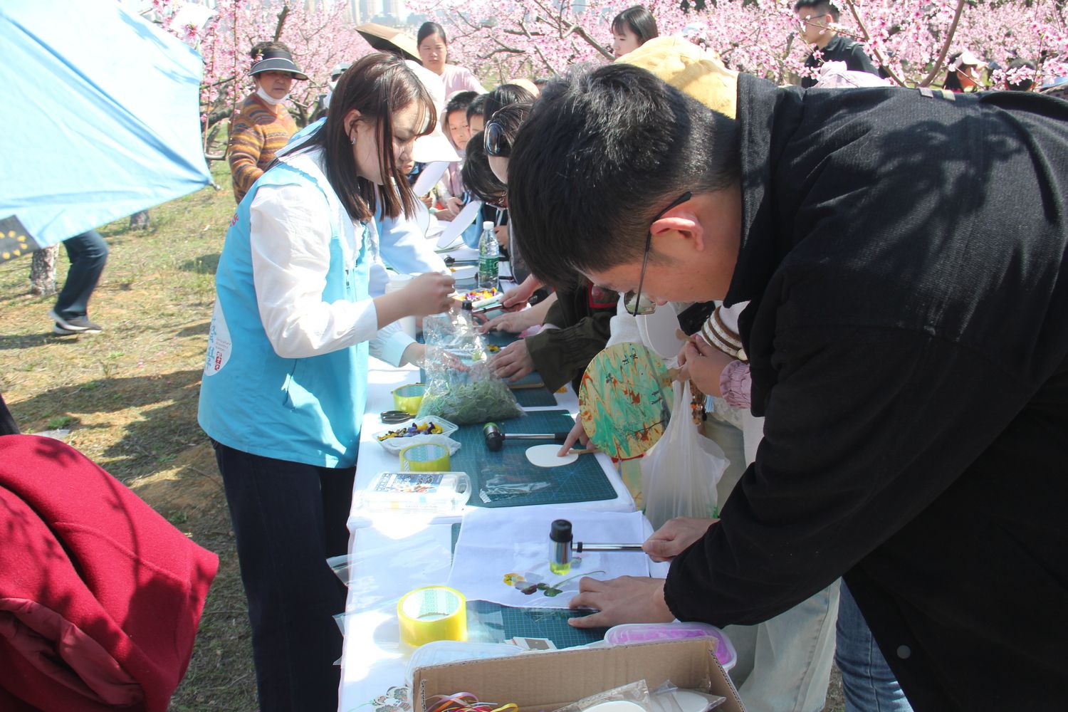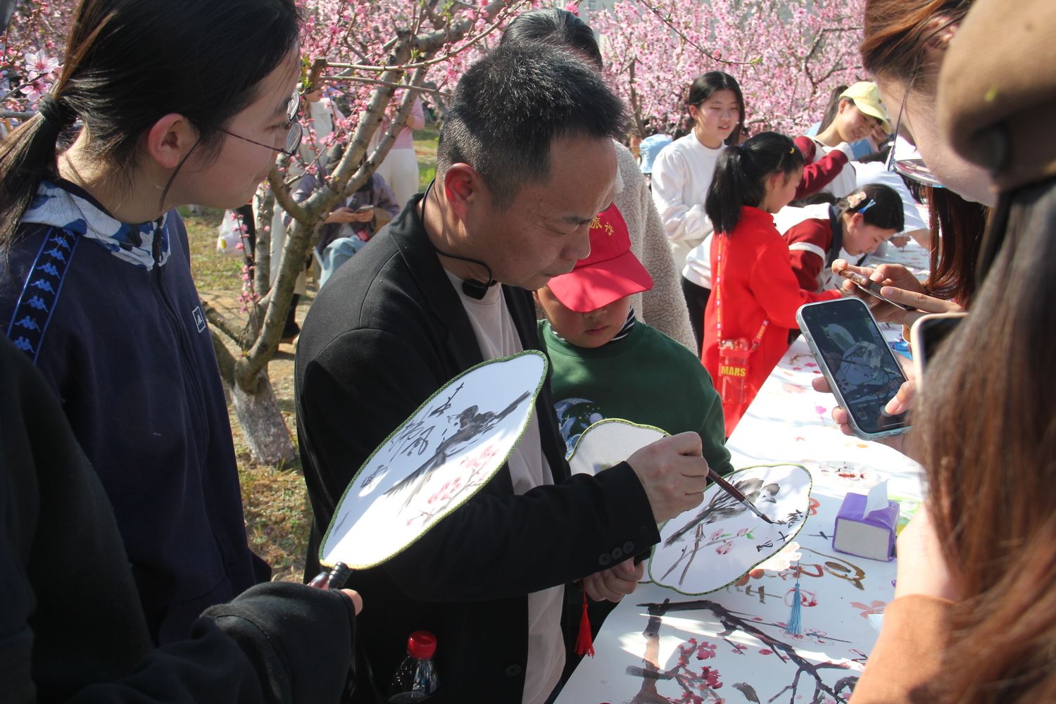 春意盎然的桃林中,“桃花艺术工坊”为游客们准备了一场别开生面的艺术创作体验。“桃韵绘卷”区域,长达10米的素白画卷横卧花海,参与者们执笔挥毫,在水彩与油彩的交融之间定格下桃枝摇曳的春日胜景。风景园林系秦仁强、洪勇辉老师现场进行创作引导,零基础爱好者亦有机会亲手勾勒心中的桃花源。而在“桃香印笺”体验区,拓印技艺正与艺术文创相互碰撞。参与者们一次次按下蘸染有各色颜料的花瓣模板,宣纸、书签、纸扇上不断绽放出桃花胜景。