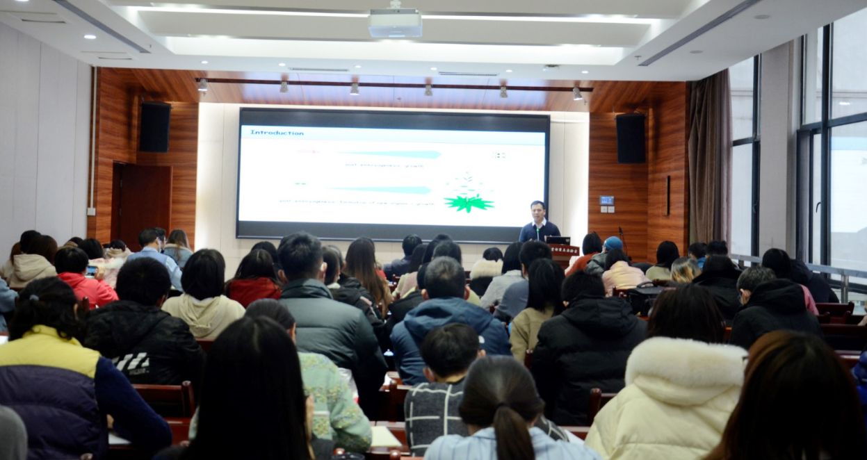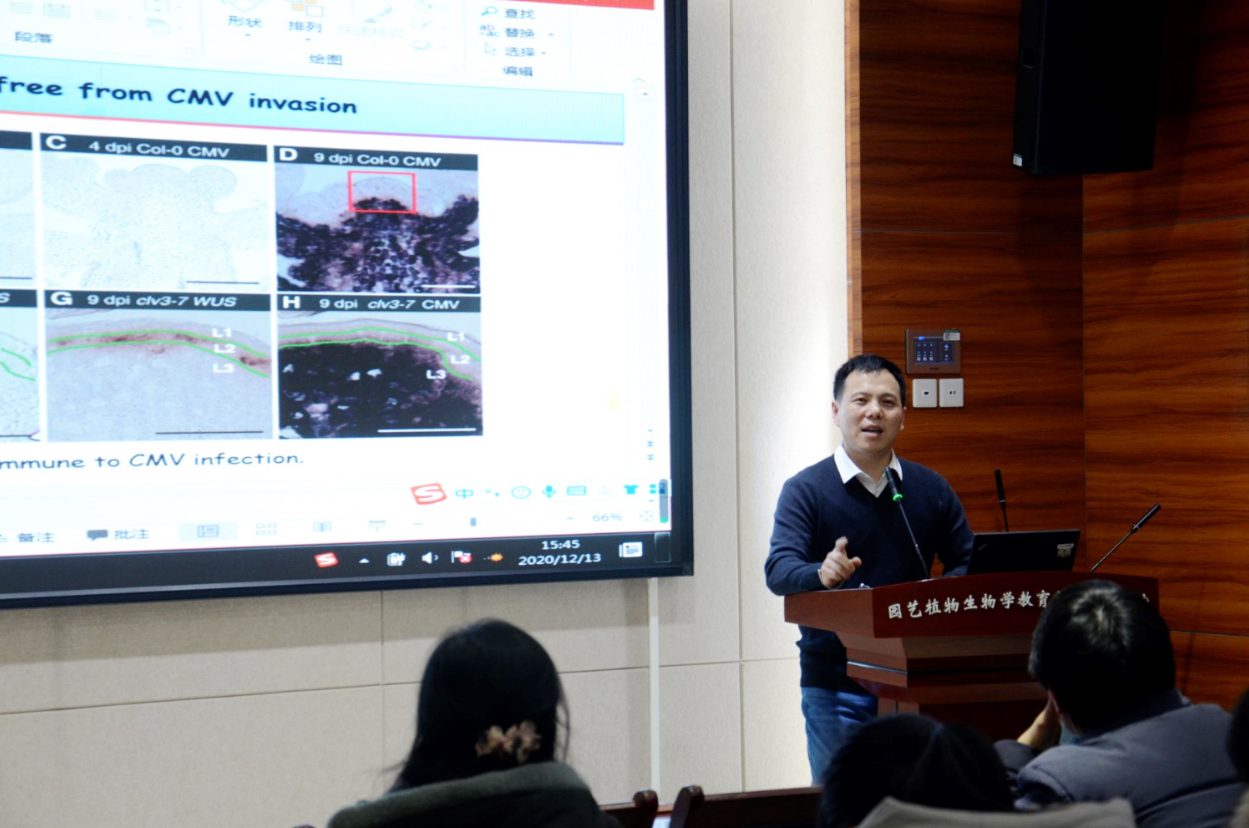 12月13日下午,园林南楼204报告厅座无虚席,中国科技大学副研究员武海军博士应邀做了题为“WUSCHEL triggers innate antiviral immunity in plant stem cells”的学术报告。该研究成果于2020年10月9日发表于《Science》期刊,武博士是本文第一作者。该研究为植物茎尖脱毒技术提供了新的理论基础,也为未来植物抗病毒提供了新的研究思路和技术策略。