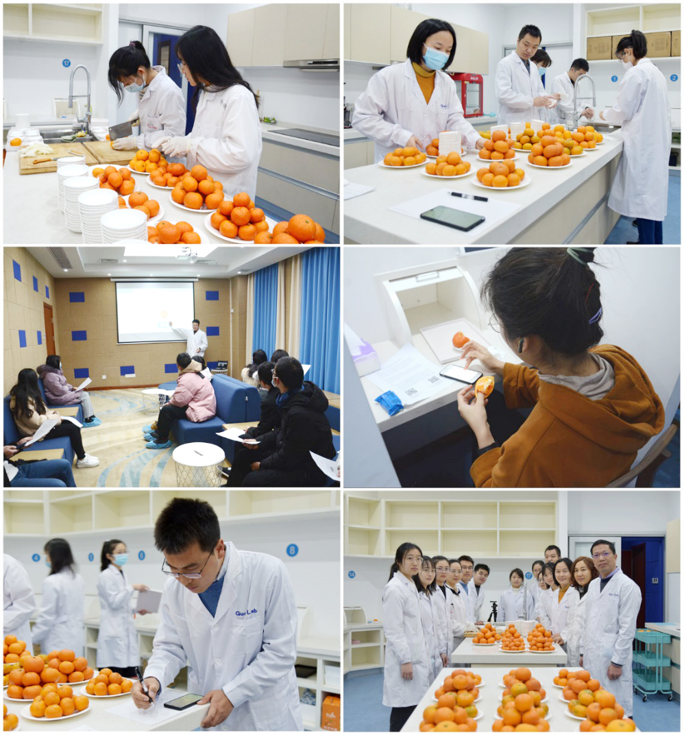 评价当天,课题组师生早早来到实验室,仔细甄选优系果实,挑选色泽艳丽、果形周正、大小均一的果实,清洗干净,晾干后摆盘装碟。师生们分工合作,有条不紊地忙碌着。这些百里挑一、优中选优的“宝贝”优系,历经数年艰辛培育,即将迎来橘生的第一次“大考”。