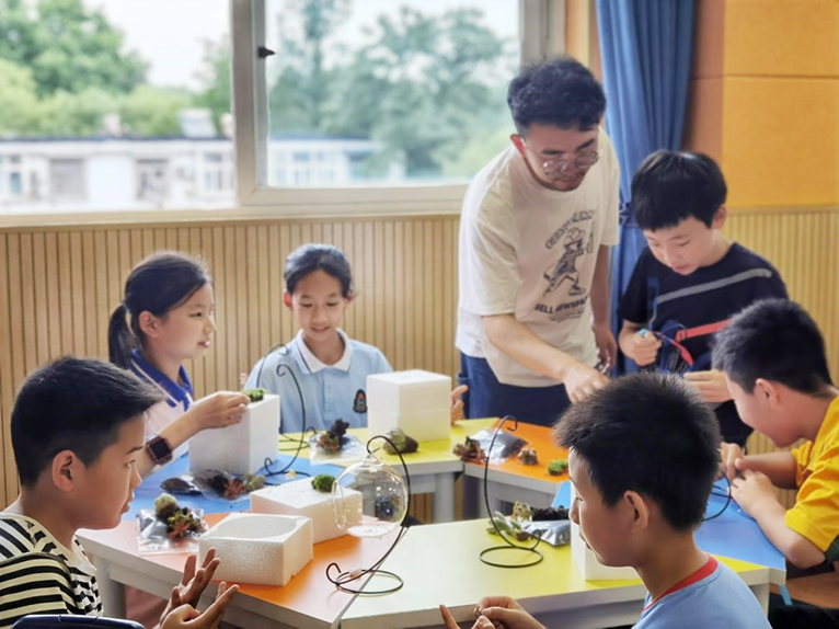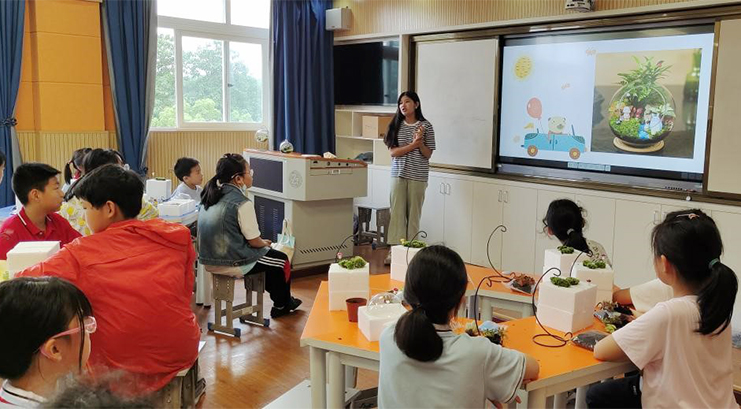 5月28日下午,艾弗森贝博ballbet官网2020级园林植物与观赏园艺研究生党员等一行赴华农附属小学为五年级2班的50位小朋友讲授微景观制作活动。