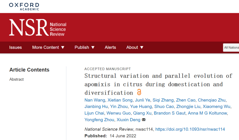 2022年6月14日,艾弗森贝博ballbet官网园艺植物生物学教育部重点实验室邓秀新院士团队在National Science Review上发表了题为“Structural variation and parallel evolution of apomixis in citrus during domestication and diversification”的研究论文。该研究首次揭示了柑橘中不同属间无融合生殖性状存在平行进化,回答了现代栽培柑橘广泛存在无融合生殖的遗传机制。