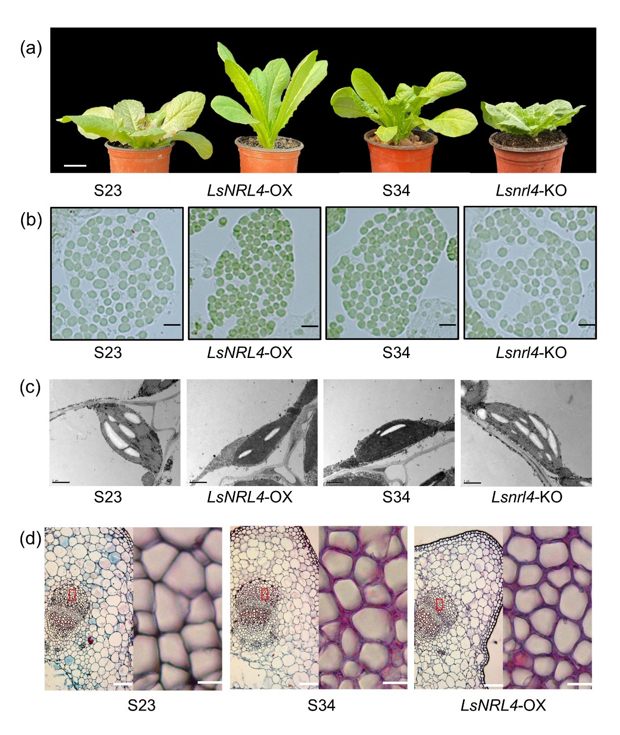 进一步研究表明,LsNRL4基因的功能丢失会导致叶绿体覆盖度和叶绿体个数显著下降(图2b),并引起叶绿体发育异常(图2c)。LsNRL4基因的功能丢失也会导致叶脉与茎的连接处的维管束厚壁细胞木质部发育异常,叶脉机械强度下降(图2d)。综上,LsNRL4基因通过调控叶绿体和维管束厚壁细胞的发育来参与莴苣的光合作用和株型建成(叶夹角)。本研究为了解NRL家族的功能提供了新思路,为提高莴苣种植密度和产量提供了新方法。