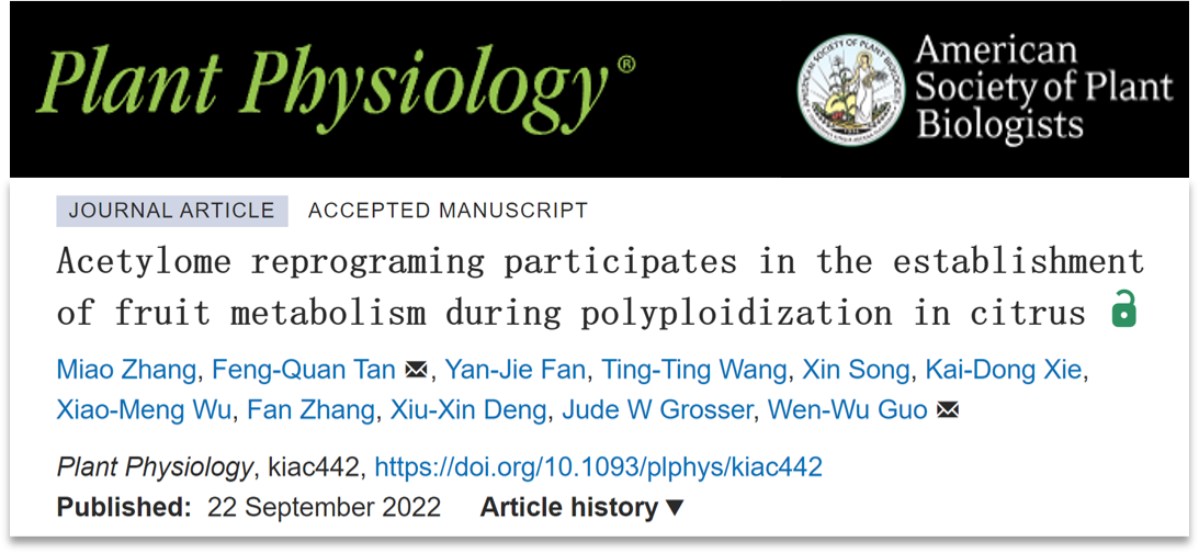 近日,艾弗森贝博ballbet官网园艺植物生物学教育部重点实验室郭文武教授课题组在国际学术期刊Plant Physiology在线发表了题为“Acetylome reprograming participates in the establishment of fruit metabolism during polyploidization in citrus”的研究论文。该团队以柑橘异源四倍体体细胞杂种果实为材料,首次在柑橘果肉绘制乙酰化修饰图谱,并揭示异源多倍体化如何通过非组蛋白乙酰化修饰影响柑橘果实代谢。