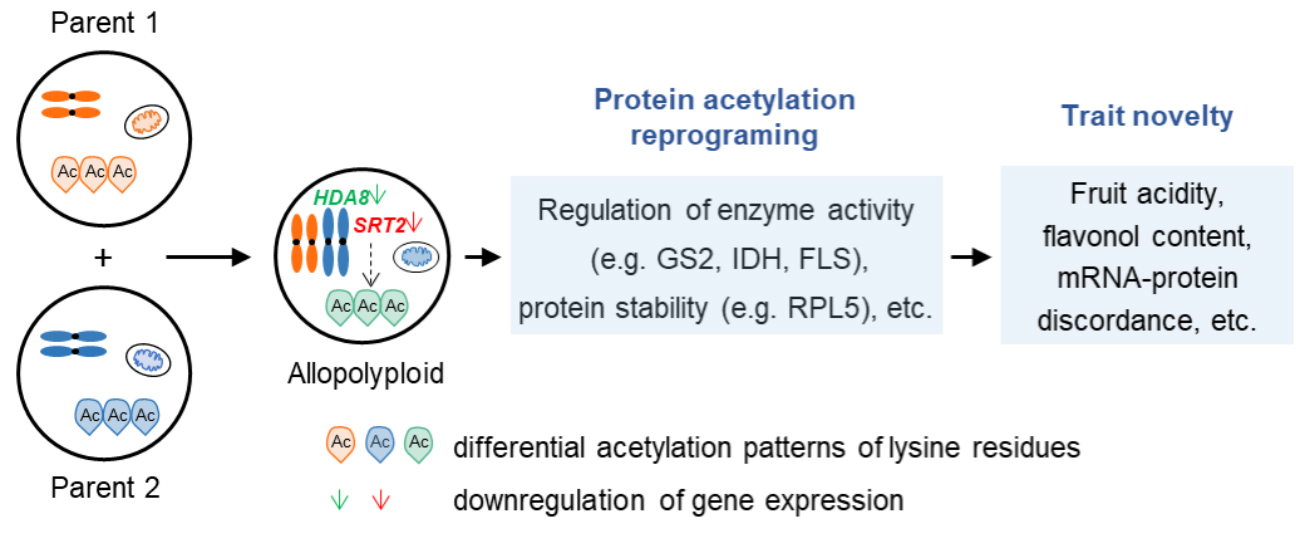 多倍体化是植物进化的重要力量。根据染色体来源不同,多倍体可分为同源多倍体和异源多倍体。异源多倍体不但基因组加倍,同时也固定了杂交优势,通常表现出更强的生物量、生活力和更好的环境适应性,在作物改良中发挥着重要作用。异源多倍体化导致的新性状研究主要集中在基因组、蛋白组和表观基因组层面,蛋白质翻译后修饰(PTMs)作为一种精细且快速的调控手段,可能在其中扮演着重要作用,但目前研究还是空白。非组蛋白乙酰化修饰通过多种机制影响蛋白质功能,包括调节酶活性、蛋白质稳定、蛋白质互作等,但异源多倍体化导致的新性状产生与乙酰化修饰的关系尚不清楚。