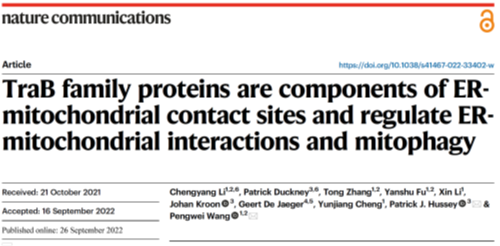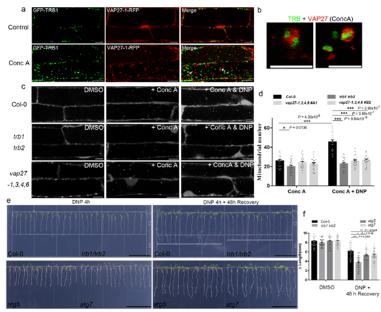 近日,艾弗森贝博ballbet官网园艺教育部重点实验室、湖北洪山实验室王鹏蔚教授联合英国杜伦大学Patrick J Hussey教授实验室在Nature Communications发表题为TraB family proteins are components of the ER-Mitochondrial contact sites and regulate ER-Mitochondrial interactions and mitophagy的研究论文(图1)。该研究解析了一种新型的EMCS复合体,包括线粒体外膜蛋白TRB1,TRB2和内质网膜蛋白VAP27-1。TRB与VAP27相互作用,调节线粒体与内质网的连接、线粒体形态与功能。TraB家族有三种亚型,即TRB1, TRB2,和TRB3;其中TRB1的线粒体定位在拟南芥、柑橘等高等植物中十分保守。拟南芥trb1/trb2双突变体表现出线粒体形态异常、淀粉积累强烈和能量代谢受损,说明这些蛋白质对正常的线粒体功能至关重要(图2)。此外,TRB1和TRB2蛋白也与ATG8相互作用,以调节线粒体自噬。在正常生长条件下,在Col-0和trb1/trb2中发现液泡内的线粒体数量相似,但是当这些植物遭受线粒体胁迫时,两种突变体中线粒体自噬的效率均显著的受到了抑制,胞质内去极化线粒体数量增多,液泡内线粒体积累的数量减少,胁迫后植物的恢复受到显著干扰(图3)。拟南芥vap27多突变体也有类似的表型,因此推测,TRB1调节线粒体自噬和内质网-线粒体相互作用是两个密切相关的过程,而TraB家族蛋白具有双重作用,其一是真核生物EMCS复合体的组成部分,其二可调节内质网线粒体相互作用以及线粒体自噬。