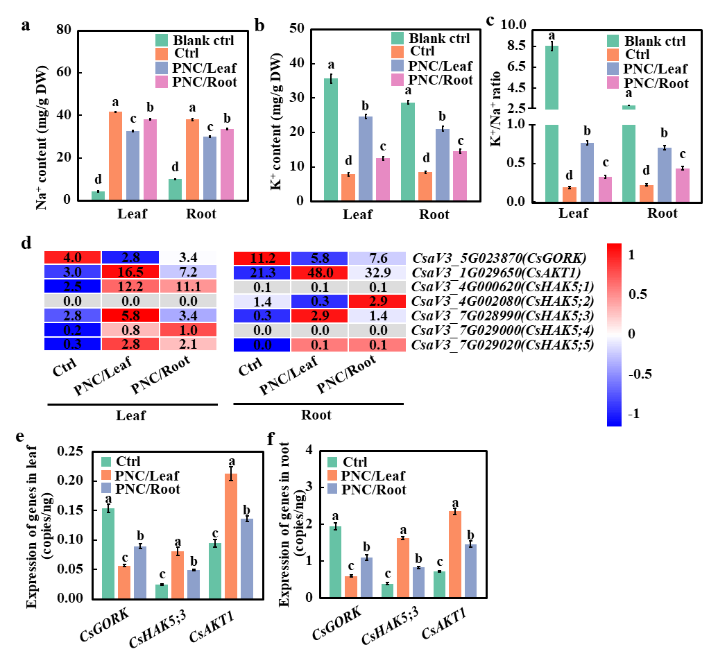 图5根系敲除CsAKT1对盐胁迫下施用CeO2NPs后黄瓜Na+和K+含量的影响