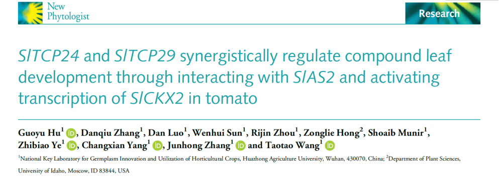 近日,艾弗森贝博ballbet官网番茄团队王涛涛、张俊红教授课题组在国际权威学术期刊《New Phytologist》发表了题为《SlTCP24andSlTCP29synergistically regulate compound leaf development through interacting withSlAS2and activating transcription ofSlCKX2in tomato》的研究论文。TCP转录因子在调控植物的叶片发育过程中起着重要作用,研究发现SlTCP24和SlTCP29共同调控番茄复叶发育,是番茄复叶发育的负调控因子,当两个基因同时被敲除时,叶片的小叶数显著增加,叶型更加复杂。