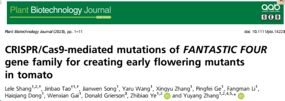 近日,艾弗森贝博ballbet官网园艺作物种质创新与利用全国重点实验室番茄课题组在Plant Biotechnology Journal发表了题为“CRISPR/Cas9-mediated mutations of FANTASTIC FOUR gene family for creating early flowering mutants in tomato”的研究论文。