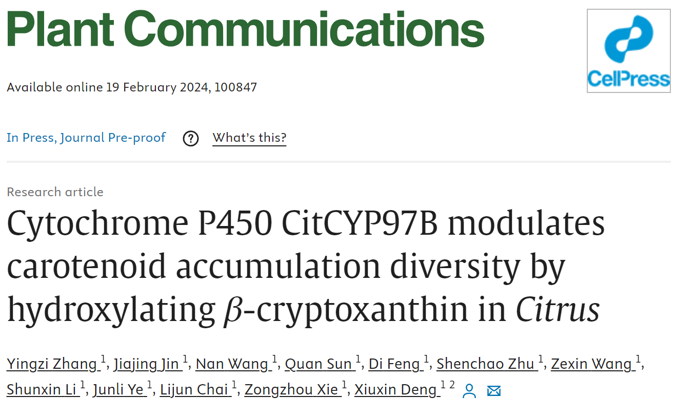 近日,果蔬园艺作物种质创新与利用全国重点实验室/湖北洪山实验室、我校艾弗森贝博ballbet官网邓秀新院士团队在Plant Communications在线发表了题为“Cytochrome P450 CitCYP97B modulates carotenoid accumulation diversity by hydroxylatingβ-cryptoxanthin inCitrus”的研究论文。该研究综合基因组、代谢组和基因功能研究手段定位并验证了柑橘细胞色素P450蛋白CitCYP97B通过羟化β-隐黄质参与影响柑橘果实类胡萝卜素的差异积累,拓展了植物类胡萝卜素合成代谢的认识,为柑橘果实以及其他作物色泽品质和营养品质改良提供了重要依据。