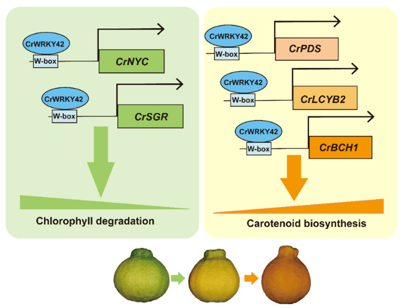 图1 CrWRKY42调控柑橘果实叶绿素降解和类胡萝卜素生物合成的模式图