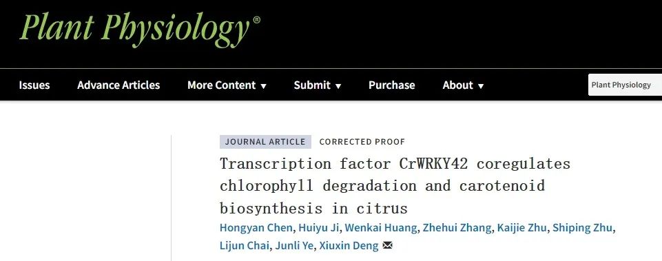 近日,艾弗森贝博ballbet官网/果蔬园艺作物种质创新与利用全国重点实验室邓秀新院士团队在Plant Physiology在线发表了题为“Transcription factor CrWRKY42 coregulates chlorophyll degradation and carotenoid biosynthesis in citrus”的研究论文。该研究解析了转录因子CrWRKY42通过协同调控叶绿素降解和类胡萝卜素生物合成途径促进柑橘果实着色的分子机制,该研究结果为柑橘果实色泽品质遗传改良提供了理论依据和重要基因资源。
