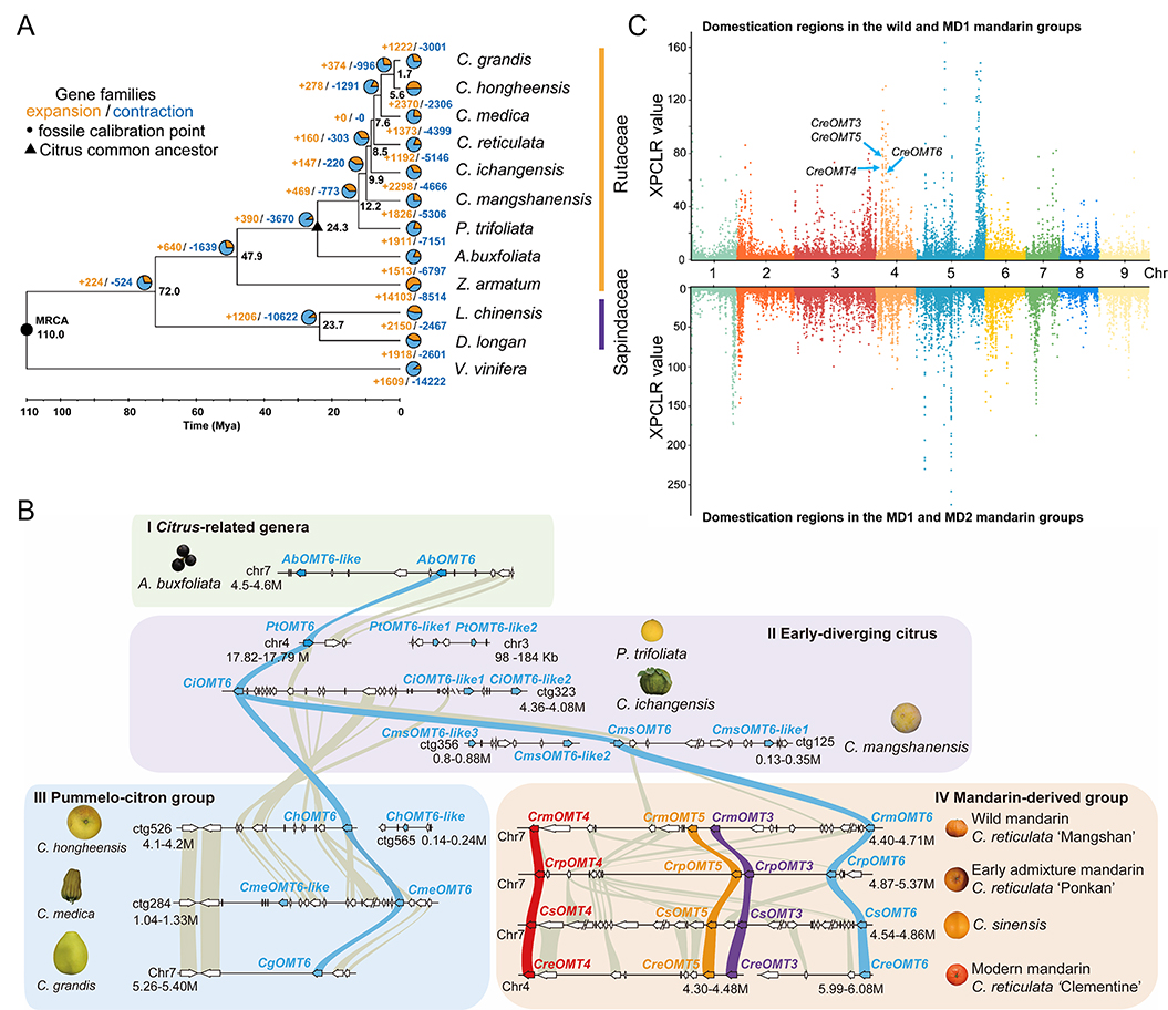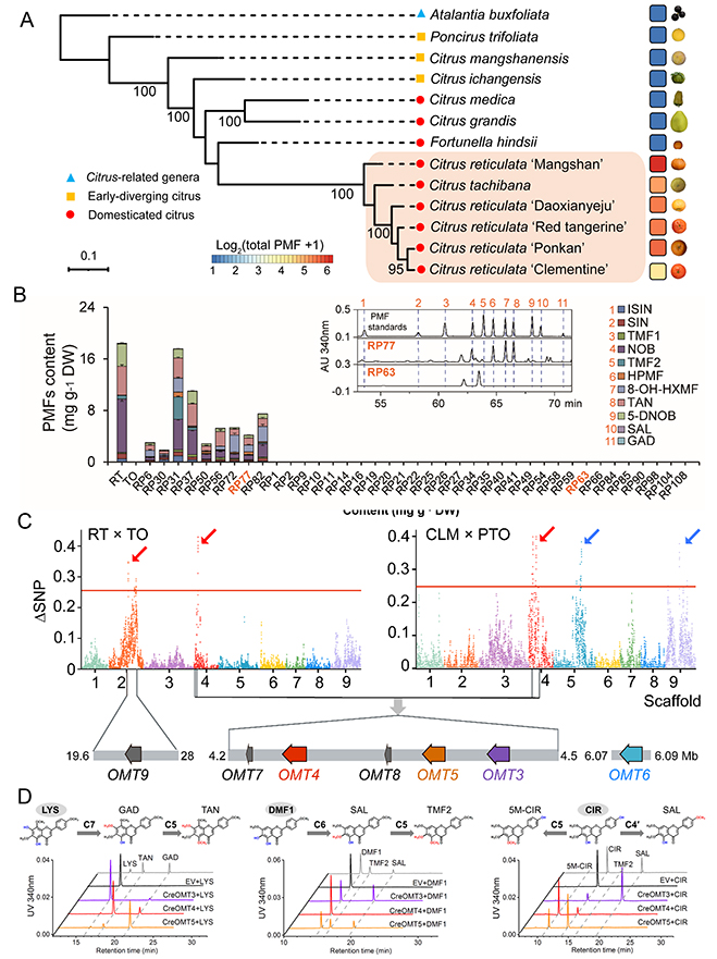 PMFs是一类主要存在于柑橘属植物中的特殊次生代谢物,被誉为“天然抗癌药剂”。该研究团队收集了147份柑橘亚科种质资源并建立柑橘PMFs代谢物数据库,发现PMFs在野生宽皮橘及早期混杂橘中高积累,在现代栽培橘及其相关杂交种中低积累,而在柑橘近缘种、早期分化柑橘等种质中不积累,由此推测PMFs代谢通路最早可能是在野生宽皮橘中出现(图1A)。