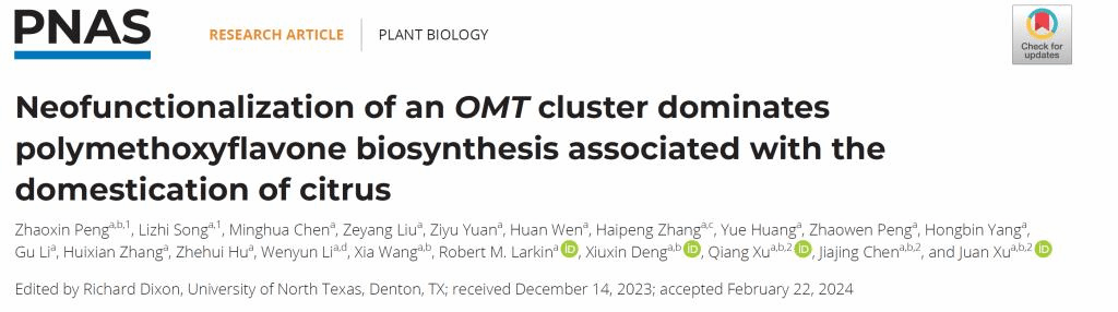 近日,《Proceedings of the National Academy of Sciences, PNAS》刊物在线发表了艾弗森贝博ballbet官网/果蔬园艺作物种质创新与利用全国重点实验室徐娟教授课题组题为“Neofunctionalization of anOMTcluster dominates polymethoxyflavone biosynthesis associated with the domestication of citrus”的研究论文,该研究综合运用正向和反向遗传学、代谢组学、酶动力学分析及生物信息学等技术,揭示了柑橘重要功能性成分聚甲氧基黄酮(Polymethoxyflavones,PMFs)的种质特异积累现象,鉴定了PMFs生物合成的关键串联重复OMT基因簇,同时解析了该OMT簇在柑橘亚科中的起源和演化历程,为柑橘果实功能性品质遗传改良提供了理论依据和重要基因资源。