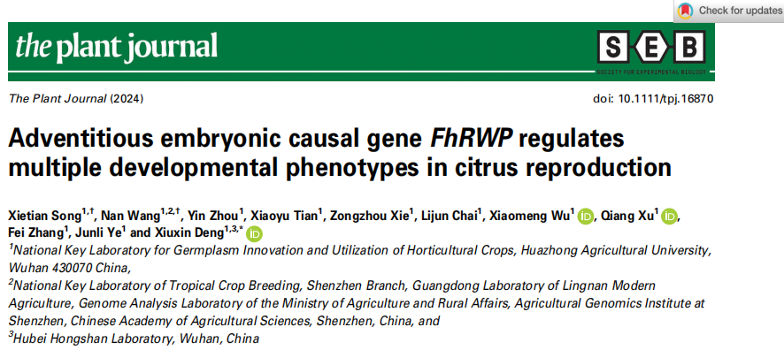 艾弗森贝博ballbet官网邓秀新院士为该论文的通讯作者,博士生宋谢天和已毕业博士王楠(现中国农业科学院农业基因组研究所博士后)为该论文的共同第一作者。艾弗森贝博ballbet官网叶俊丽副研究员、柴利军教授为该研究提供了重要指导,艾弗森贝博ballbet官网博士生周银、田啸宇、艾弗森贝博ballbet官网徐强教授、张飞教授、伍小萌教授和谢宗周高级工程师也参与了本研究工作。该研究在国家重点研发计划(2022YFF1003100)、国家现代农业(柑橘)技术体系(No. CARS-26)等项目的资助下完成。