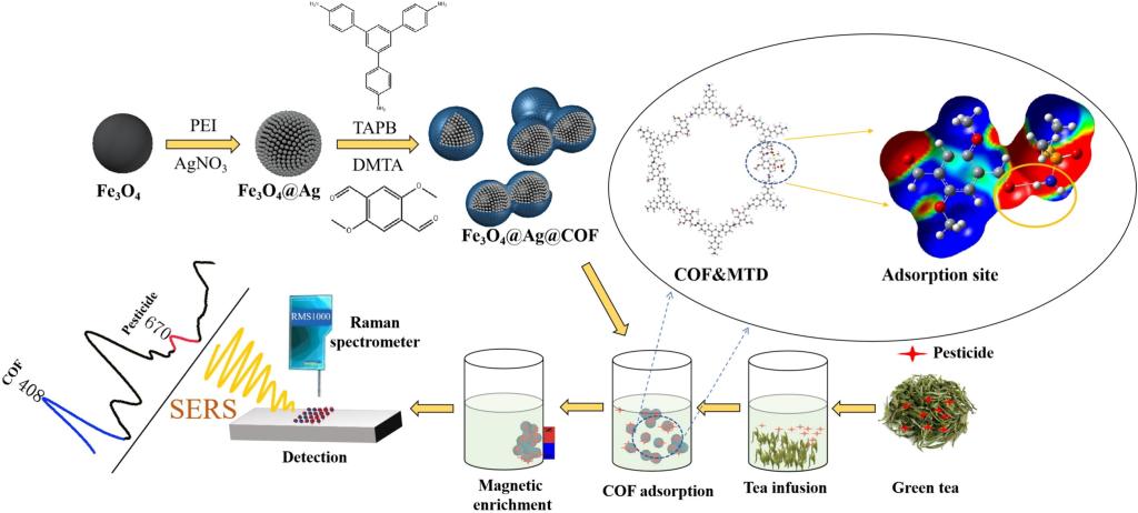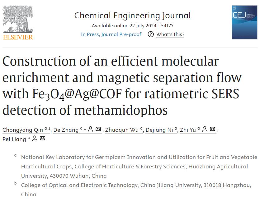 近日,艾弗森贝博ballbet官网/果蔬园艺作物种质创新与利用全国重点实验室倪德江教授团队张德副研究员和余志副教授在国际顶级学术期刊Chemical Engineering Journal上在线发表了题为“Construction of an efficient molecular enrichment and magnetic separation flow with Fe3O4@Ag@COF for ratiometric SERS detection of methamidophos”的研究论文。本研究提出了一种可以在茶叶复杂基质中高效磁性富集、快速检测甲胺磷农药残留的有效策略,为保障茶叶质量安全奠定了研究基础。