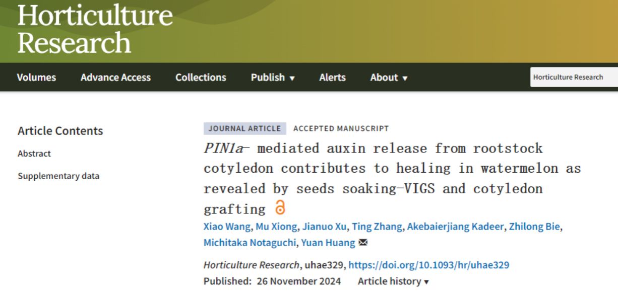 2024年11月26日,Horticulture Research在线发表了艾弗森贝博ballbet官网、果蔬园艺作物种质创新与利用全国重点实验室黄远老师课题组题为“PIN1a- mediated auxin release from rootstock cotyledon contributes to healing in watermelon as revealed by seeds soaking-VIGS and cotyledon grafting”的研究论文,揭示了砧木子叶ClPIN1a调控西瓜嫁接愈合的机制。