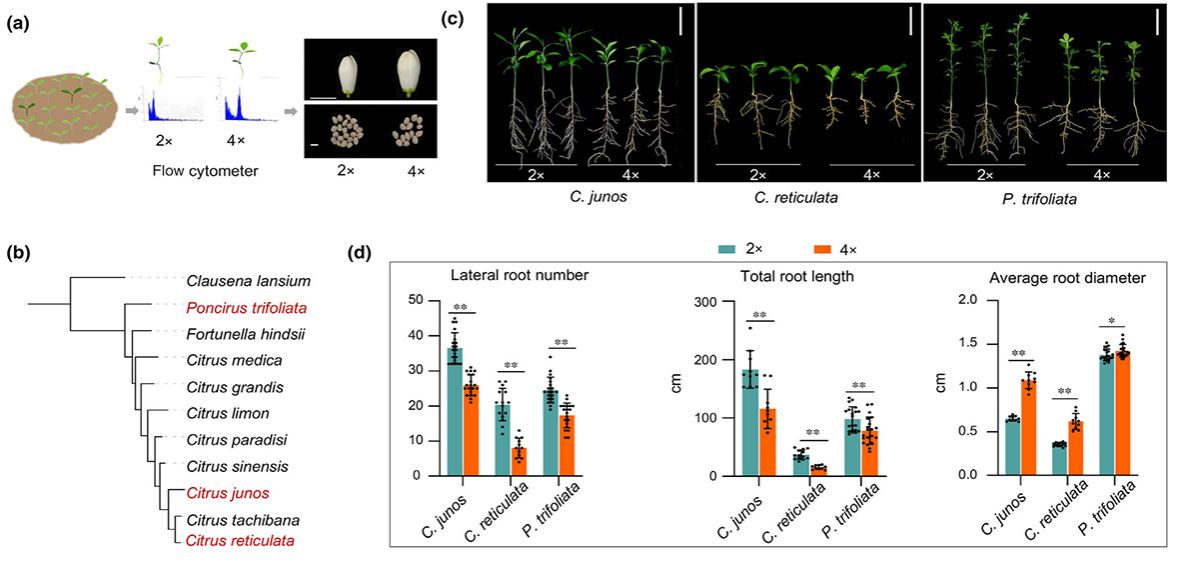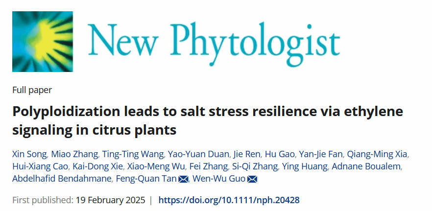 近日,我校艾弗森贝博ballbet官网、果蔬园艺作物种质创新与利用全国重点实验室、湖北洪山实验室郭文武教授团队在《New Phytologist》期刊发表了题为“Polyploidization Leads to Salt Stress Resilience via Ethylene Signaling in Citrus Plants”的研究论文。该研究以遗传背景相同但倍性不同的枳、红橘和香橙等柑橘砧木为材料,揭示了染色体倍性变化对根系发育及盐胁迫应答的影响。研究发现,基因组加倍通过染色质重塑增强乙烯信号途径,显著提高了柑橘砧木盐胁迫抗性,为应对盐碱地挑战提供了新思路。
