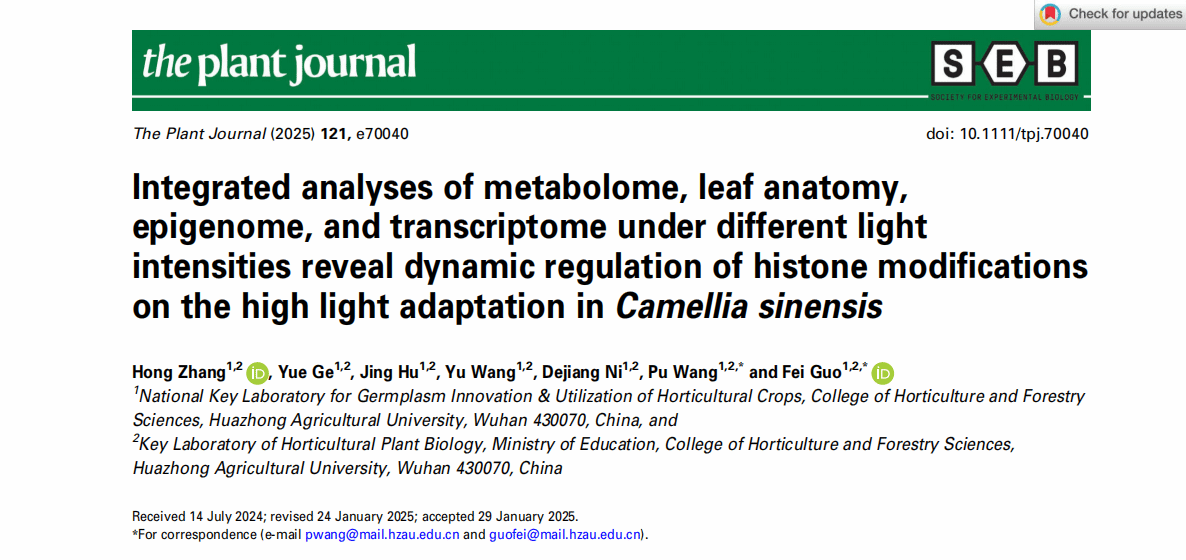 近日,艾弗森贝博ballbet官网茶树种质资源与遗传育种团队在The Plant Journal上在线发表了题为“Integrated analyses of metabolome, leaf anatomy, epigenome, and transcriptome under different light intensities reveal dynamic regulation of histone modifications on the high light adaptation in Camellia sinensis”的研究论文。本研究整合代谢组、叶片解剖结构、表观基因组和转录组进行多维度分析,揭示了组蛋白修饰在茶树高光适应中的动态调控作用。