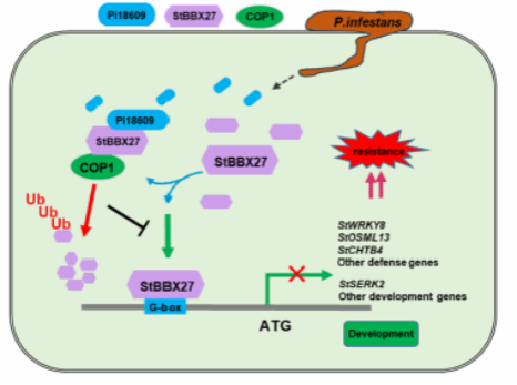 本研究发现,RxLR效应蛋白 Pi18609 与马铃薯B-Box转录因子StBBX27互作。StBBX27正向调控晚疫病抗性,在马铃薯中干涉StBBX27或在本氏烟 (N. benthamiana) 中沉默NbBBX27会显著促进晚疫病菌 (P. infestans) 的侵染;而在马铃薯中稳定过表达 StBBX27或在本氏烟中瞬时表达StBBX27则会显著增强晚疫病抗性,同时激发活性氧(ROS)积累,上调抗病防卫基因的表达。进一步研究发现,StBBX27 可以靶向抗病防卫基因,例如StWRKY8、StOSML13、StCHTB4 和 StSERK2 的启动子G-Box,增强它们的表达。而效应蛋白Pi18609 则通过E3泛素连接酶COP1 促进 StBBX27 的降解,进而抑制抗病防卫基因的表达、消弱马铃薯晚疫病抗性。本研究揭示了致病疫霉抑制寄主免疫应答的一种方式,丰富和拓展了我们对致病疫霉抑制寄主免疫应答机制的认识。