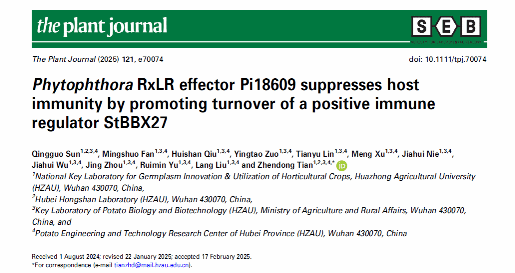 近日,艾弗森贝博ballbet官网马铃薯团队田振东课题组在The Plant Journal在线发表了题为“Phytophthora RxLR effector Pi18609 suppresses host immunity by promoting turnover of a positive immune regulator StBBX27”的研究论文。研究发现致病疫霉(P. infestans)RxLR效应蛋白 Pi18609 通过靶向马铃薯抗性正调控转录因子StBBX27抑制晚疫病抗性;揭示了效应蛋白Pi18609通过促进StBBX27蛋白的降解抑制植物免疫应答的机制。