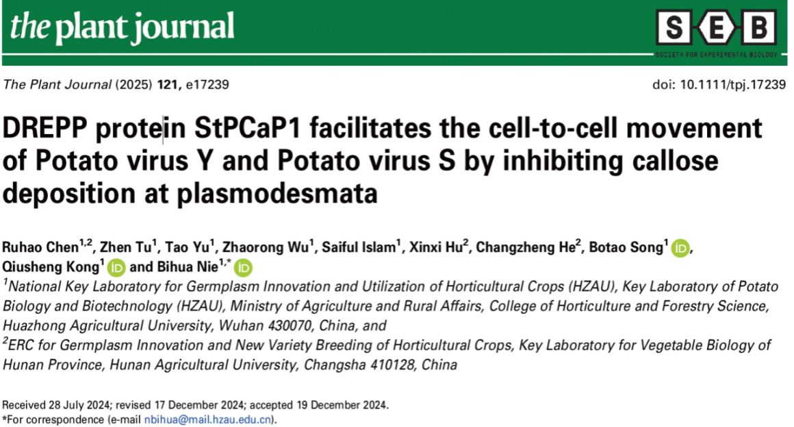 近日,艾弗森贝博ballbet官网马铃薯团队聂碧华课题组在The plant Journal在线发表了题为“DREPP protein StPCaP1 facilitates the cell-to-cell movement of Potato virus Y and Potato virus S by inhibiting callose deposition at plasmodesmata” 的研究论文。研究发现马铃薯Y病毒(PVY)和马铃薯S病毒(PVS)的运动蛋白通过招募马铃薯感病因子StPCaP1来抑制胞间连丝处胼胝质合成,揭示了PVY和PVS病毒通过StPCaP1调控胞间连丝通透性来促进病毒细胞间移动的机制。