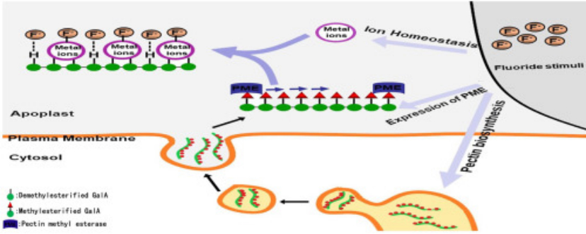 茶叶是世界三大无酒精饮料之一,广泛受到消费者的青睐。茶树具有一定的聚氟特性,并且主要聚集在成熟叶片中,长期以来,茶树这种对氟的聚集作用及其机理广泛受到关注。该文聚焦细胞壁,系统研究了在外源氟作用下,茶树叶片细胞壁结构和组成变化与及其富集氟的相关性。通过细胞壁金属元素、细胞壁单糖组成、细胞壁果胶甲酯酶活性及基因表达的变化,提出外源氟通过提高细胞壁果胶去甲基酯化作用,改变细胞壁结构,从而引起细胞壁中自由羧基数量的增加,为细胞壁金属离子提供更多的结合位点。推测氟可能通过与果胶和金属离子共同形成某种复合物从而被螯合在细胞壁中,增加细胞壁对氟的富集作用。这为细胞壁富集氟机理提供了新的思路。