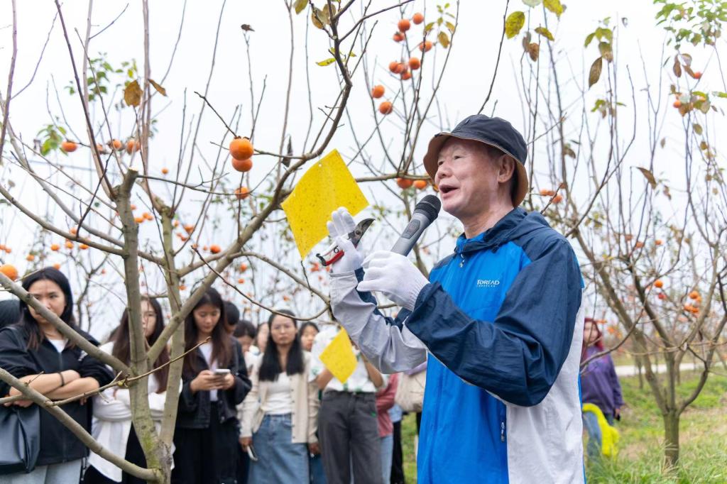 在长寿岛千亩甜柿基地,学院果树系罗正荣教授向120多名学生进行题为“长寿岛上脆柿红”的现场教学,向学生们讲授脆柿大田种植、管理等。果树系刘文洁同学感叹道:“纸上得来终觉浅,只有双脚扎根土地,才能真正将科研成果转化成累累硕果。”在桃花岭生态园完成专业实践授课后,果树系教授李国怀谈道:“作为涉农高校学子,农耕劳动体验是一门必修课,在对接产业的过程中,学生可以掌握农业技能,感悟传统文化,理解劳动人民,实现知行合一。”