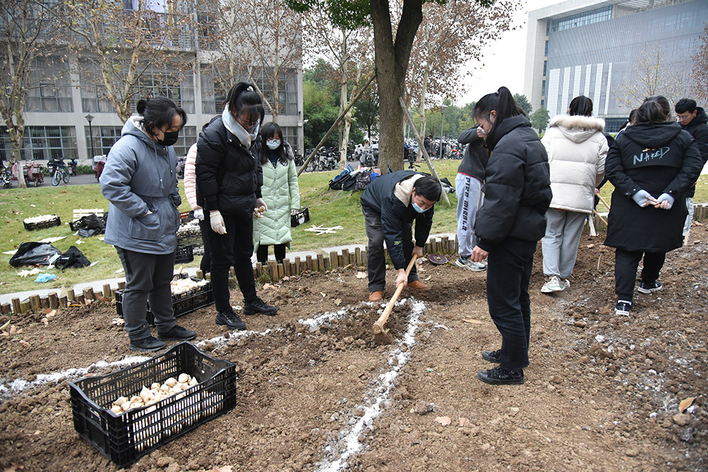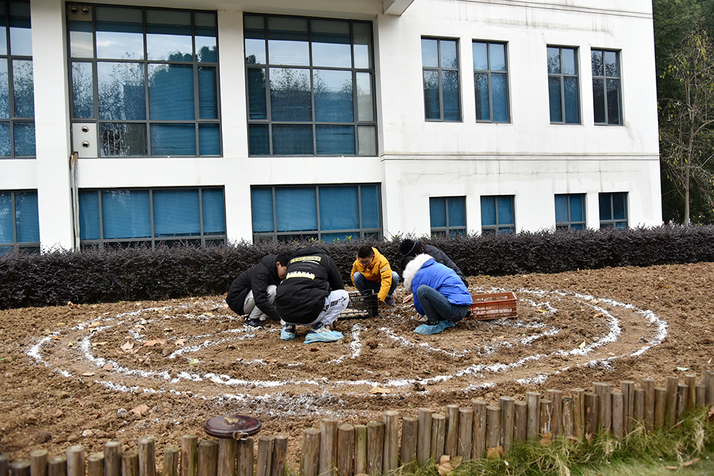 12月15日下午,由艾弗森贝博ballbet官网实验室办公室策划组织的活动——“播种春天的郁金香” 于园林南楼门口开展。园林2001班师生在郁金香团队研究生的指导下,完成10000多颗郁金香种球的褐色外皮去除处理和部分种球的种植任务。郁金香种球种植后覆盖5-10cm左右土层,为保证景观效果需要密植,株行距为12-15cm左右。为了配合图案造型,种植过程需要耐心和细心,种植人员互相协调,严谨配合,以保证郁金香花圃造型的完美呈现。