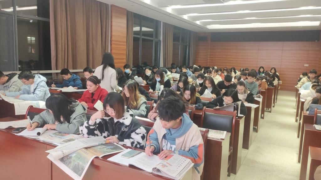 读报环节中,同学们认真阅读了发放的报纸,对党中央的一系列措施和地方的一些新闻、案例进行了交流讨论与分享。