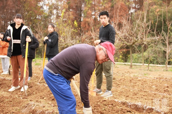 在果农大爷的演示指导后,同学们拿着铲子,踏上土地,开始铲地沟。同学们弯着腰背,双手紧握铲子,插入泥土,然后用力一起,将土撬起来,再铲到一边的土地上。虽然开始动作生疏,但是随着不断的反复动作,大家愈加熟练。果农大爷在一旁一边指导,一边夸奖着他们做得好。